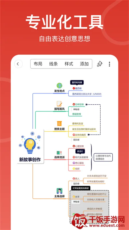 3. 界面简洁易用:简洁的使用界面设计,让用户能轻松找到所需功能,顺利进行思维导图创作,满足不同使用需求。