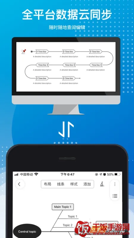 1. 多端同步便捷:支持手机、pad、电脑、网页使用,数据同步,不限时间和地域,方便在不同设备间随意查看思维导图。