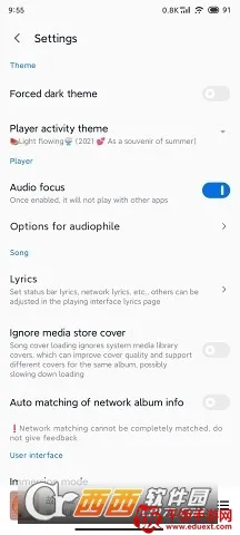 3、界面美观独特:播放界面采用动态流光效果,根据专辑封面色彩变化呈现炫丽效果,还有其他多种主题供选择,支持桌面歌词显示、横屏操作以及沉浸式播放模式,带来视觉享受升级。