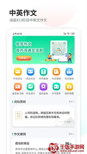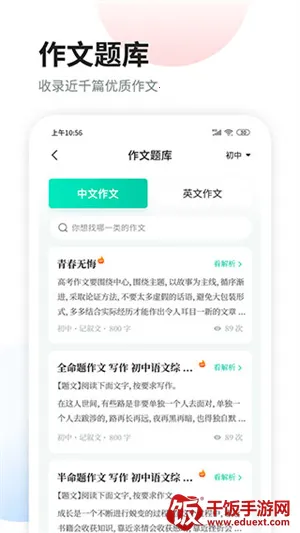 1. 海量题库资源:涵盖小学到高中各文体作文题库,含命题、半命题、话题作文及解析,为学生提供丰富的练习素材。
