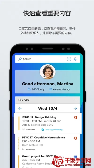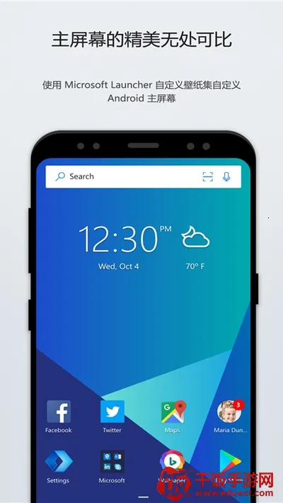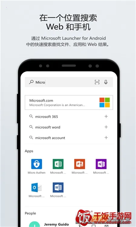 3. **强大搜索功能**:在一个位置搜索Web和手机,使用Microsoft Launcher的统一搜索栏搜索Web或文件、应用、文档、消息和Web结果。